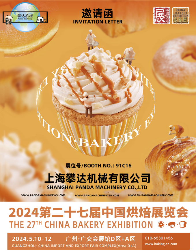 SHANGHAI PANDA MACHINERY CO.,LTD WILL BE ATTENDING THE 27TH CHINA BAKERY EXHIBITION SINCE MAY 10TH-12TH, 2024. ADDRESS: NO.380 YUEJIANGZHONG ROAD, ZHUHAI DISTRICT, GUANGZHOU CITY, CHINA. HALL NUMBER: 19.1 OUR BOOTH NUMBER: 91C16 WELCOME OUR REGULAR AND NEW PARTNERS TO MEET EACH OTHER AT THE BOOTH.